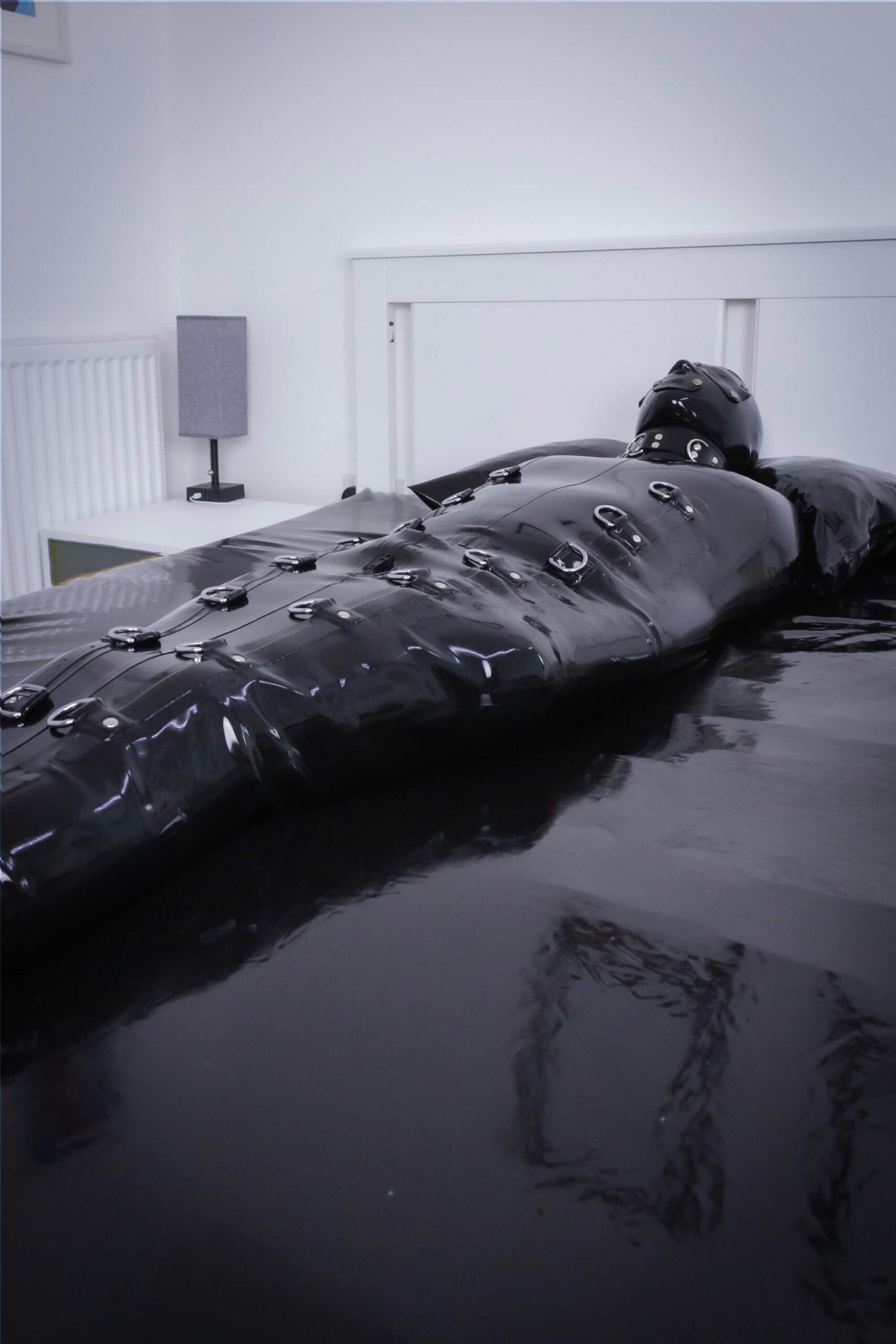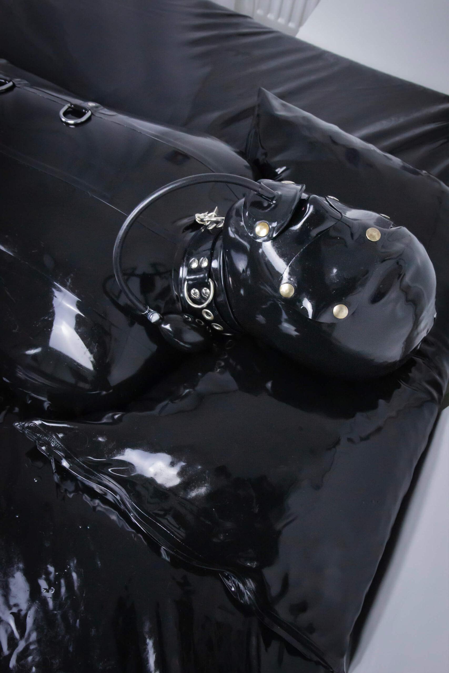 The sleek rubber fits like a second skin. Beneath the heavy bondage sack you’re locked in a full body rubber suit. The layers are so restrictive, you try to fight them… but there is no way out. You can only breathe the scent of heavy rubber air. You moan against the gag… no way out… no way out…